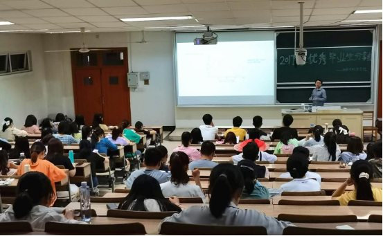 、考研信息搜集、备考内容三个方面来讲述经验。她们认为,考研的成功等于正确的方法、不懈的努力、良好的心态以及恰当的复习材料,并且建议大家也要树立正确的得失观,平常要有正常的作息,学会调整自己的心态。将赴英国留学的顾晗同学从制定适合自己的目标和计划分享经验,介绍了她从准备、申请、到面试等出国留学的全过程,为有出国意向的同学提供了一些借鉴。最后,选择考公的陶幸园同学,讲述了她自己如何准备笔试、面试,最后成功进入常州税务局的经历,解决了大家对于考公方面的一些疑问。除了收获丰富、实用的分享经验外,在场同学还进一步与分享者们进行了交流,询问更多与未来学习、就业等方面的细节问题。师生们风趣的语言、开门见山的讲述风格、清晰的条理,获得现场一致好评。