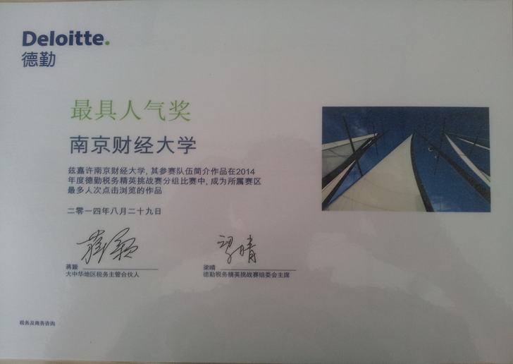 代表队脱颖而出,不仅获得2014年度德勤税务精英挑战赛(上海赛区)“最具人气奖”,而且成为江苏高校中唯一一支成功晋身全国决赛的代表队和64所高校中晋身全国决赛的13支队伍之一(其他12支代表队为北京大学、国立政治大学(台湾)、东吴大学(台湾)、香港理工大学、澳门大学、华中科技大学、中山大学、上海财经大学、中南财经政法大学、西南财经大学、江西财经大学和广东外语外贸大学)。