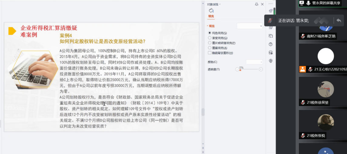 师生做了题为《企业所得税汇缴实务及风险防范》的线上学术讲座。