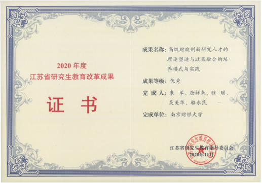 一项研究生教学成果“高级财政创新研究人才的理论塑造与政策融合的培养模式与实践”(完成人:朱军、唐祥来、程瑶、吴美华、骆永民)获江苏省研究生教育改革成果优秀奖。
