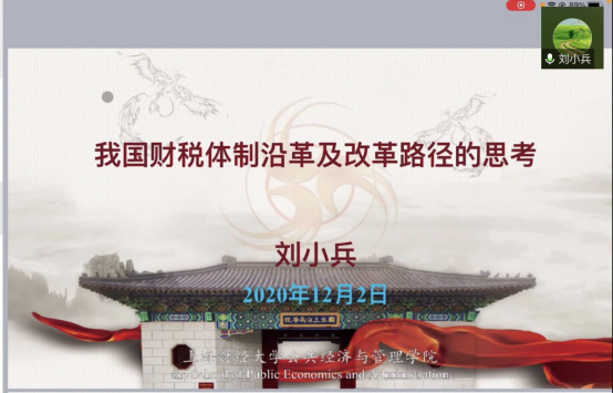 院长、中国卫生经济学会副会长、全国高校财政学教学研究会副理事长、中国财政学会理事、上海市曙光学者刘小兵教授通过腾讯会议进行了题为“我国财税体制沿革及改革路径的思考”的线上学术报告。院长朱军教授主持了本次讲座,我院部分教师和全体硕士研究生参加讲座。