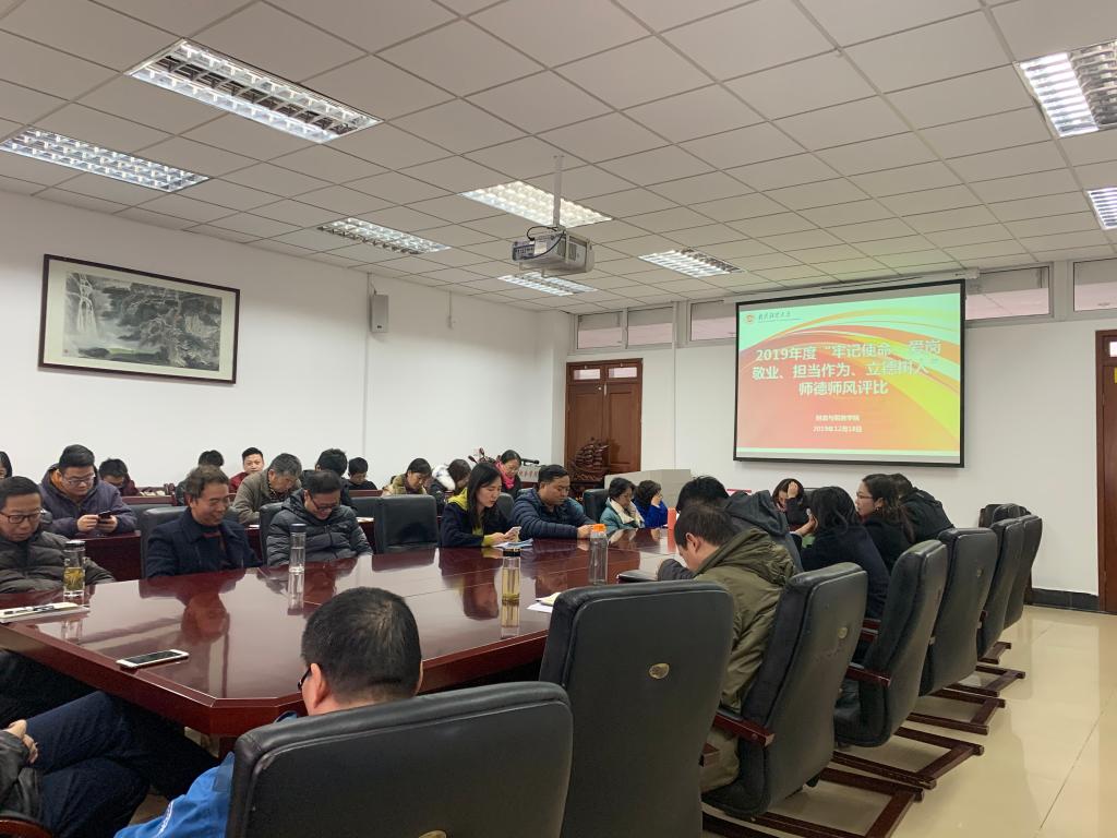 内良好的师德师风氛围,我院于年12月18日在德经楼408会议室开展2019年度“牢记使命、爱岗敬业、担当作为、立德树人”的师德师风评比活动,以此激励教师群体在教学上以学生为先,在工作上爱岗敬业,树立好为人师表的正面形象。