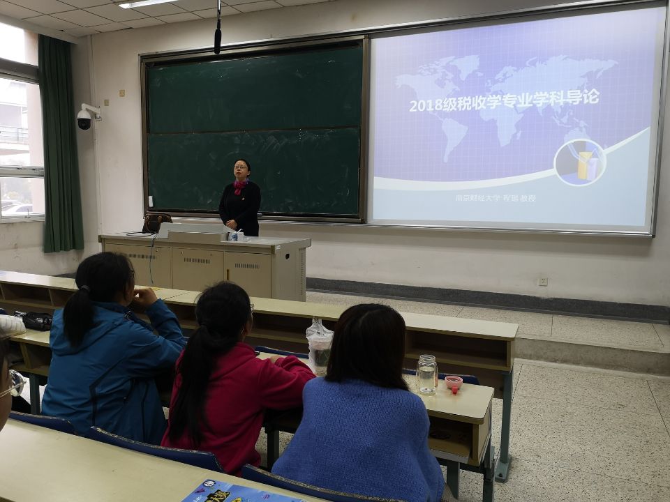 18级税收专业的学科导论课堂上,税务系主任程瑶老师佩戴党徽,给同学们从税收制度改革发展的角度,回顾了改革开放40年的伟大成就,并进一步展望了税收现代化建设的前景。通过深入浅出的讲述,刚刚接触专业学科的大一同学们,感受到税制改革与时代发展背景的息息相关,对财税人的责任也有了更深刻的体会。