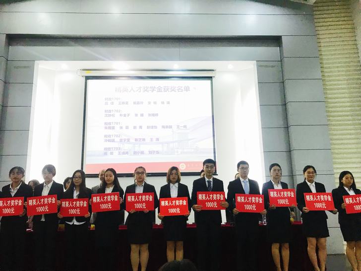 副院长管永昊宣读院精英人才奖学金获奖名单,全体与会嘉宾为获得此次“精英人才奖学金”的23名2017级学生颁奖。