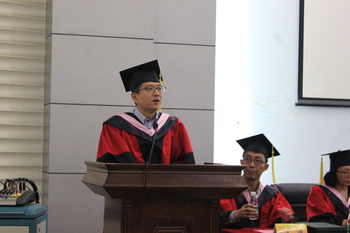 副院长黄斌教授致辞。他认为大学毕业走入社会是人生中一个十分重要的时刻,也是一段追求幸福的旅程。在这段旅程中希望同学们能不被物欲所困,而追求存在于分享、尊重和高层次人生价值中的幸福!做自己喜欢做的事,学会坚持,不轻易言弃。最后,黄院长将电影《致青春》中一句话作为结句送给毕业生:“这年华青涩逝去,却别有洞天。”