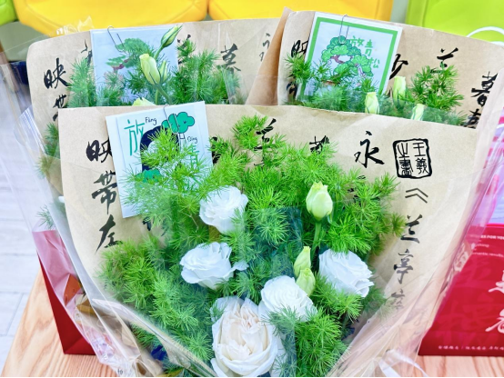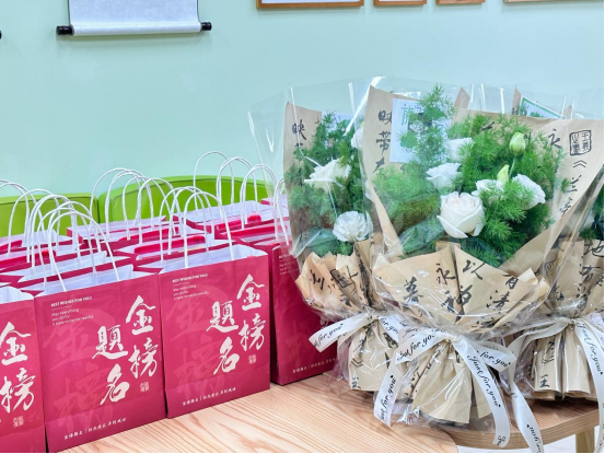 的元素、特色,也有为契合本次活动主题特意定制的标语。“笔”是考试中不可或缺的一份子,一根根精美的以紫色为表的签字笔,是希望考研学子在考试期间能够“下笔如有神”,“紫”定能行;放青松花束更是礼物包里的“重头戏”,将“青松”放入花束,更是希望考研学子能够放轻松,相信他们凭借一路以来的努力可以换来明日的成功,士力架、咖啡、美食这些常见的“助力剂”,令考研学子可以以最饱满的精神状态去迎接考试,大鹏一日同风起,扶摇直上九万里!