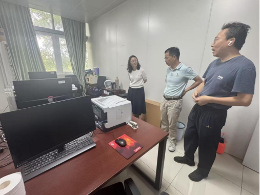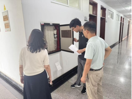 各教师办公室、行政办公区域、专业实验室等场所,重点检查用电安全、消防安全及设施设备运行情况。在办公室区域,检查组仔细查看办公设备线路是否存在老化、私拉乱接现象,提醒教职工规范使用电器、及时关闭电源;在实验室,围绕电子设备存储管理、应急处置预案等内容进行细致核查,要求实验室管理员严格落实“谁使用、谁负责”制度;针对配电箱、消防栓等关键设施,检查组逐一检查设备运行状态、消防器材有效期及安全通道畅通情况,对发现的1处配电箱缺少保护盖问题现场记录,明确整改责任人与完成时限。