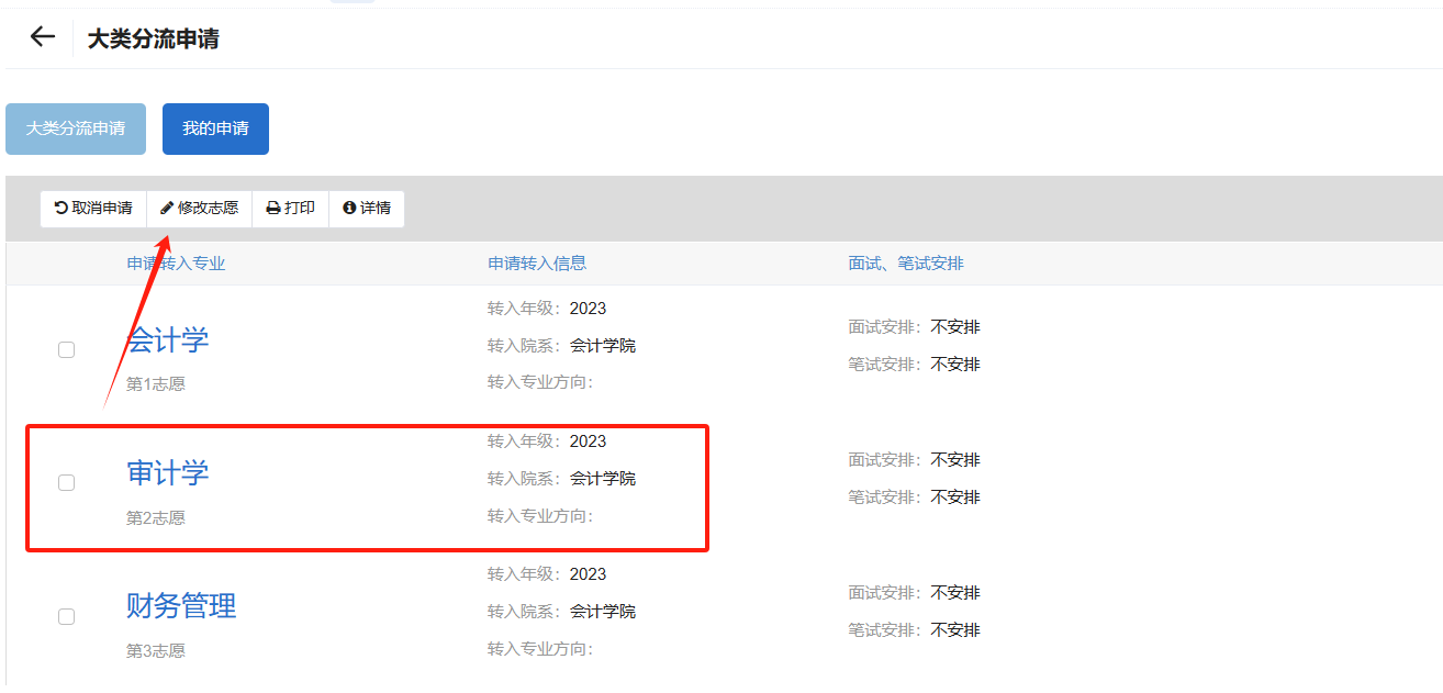 可以在我的申请页面,修改志愿顺序,方式如下,