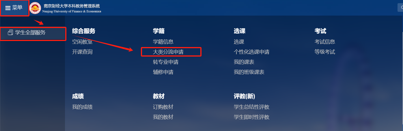 选择左上角【菜单】中的【学生全部服务】,点击【大类分流申请】进入报名页面