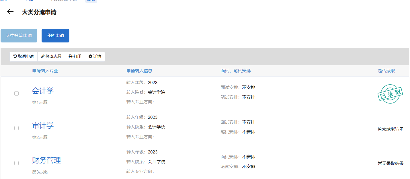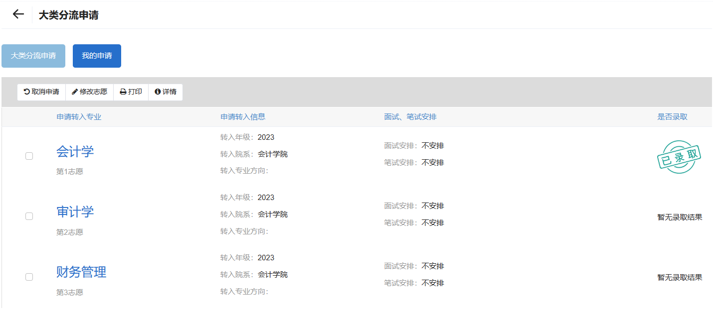 最后点击【提交】,最后录取结果将在【我的申请】页面展示,